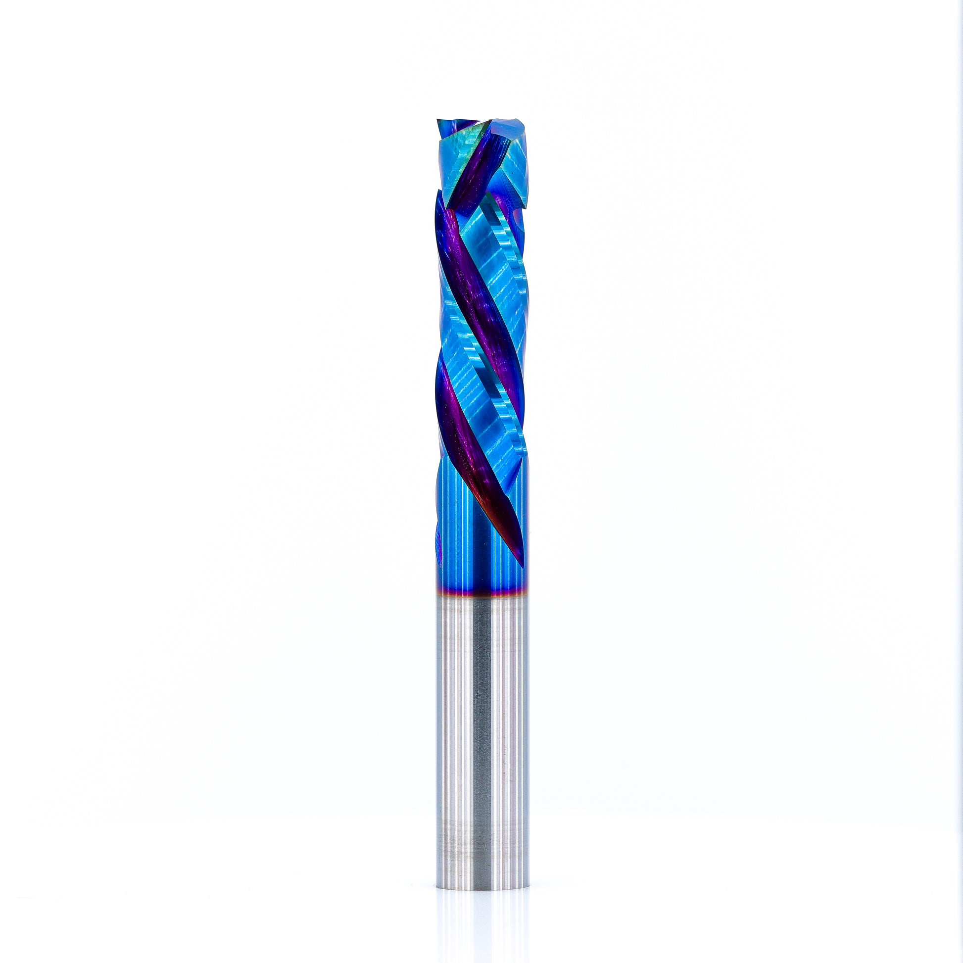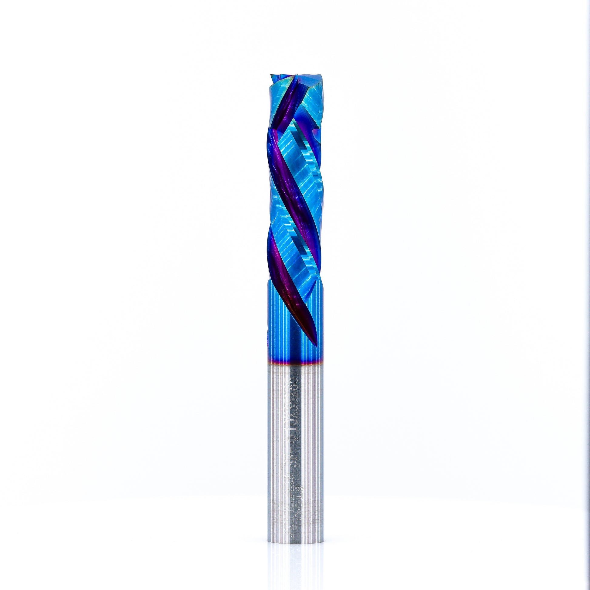 Crafted from premium ultrafine grain carbide, this tool offers a superior edge-holding ability that delivers exceptional sharpness and longevity. The triple-flute configuration allows up to 50% higher feed rates than 2-flute designs while maintaining the same flawless finish. Combined with the Nano Composite (NaCo) coating - which extends life by up to 3× over raw carbide - you can expect cooler operating temperatures and extreme edge retention. This tool sits firmly in the extreme premium range — outperformed only in lifespan by our PCD compression spirals. Perfect for high-speed CNC work in dense laminates and veneered materials where production efficiency and finish quality must be at their absolute peak.